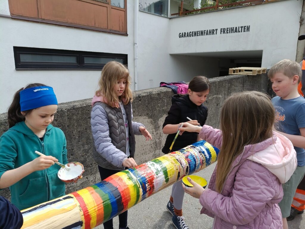 Am Dienstag um 10:10 Uhr machte sich die 3a auf dem Weg zum Bauhof, um 21 Teile des Baumes zu bemalen. Um 11:00 Uhr war dann die 3b an der Reihe. Diese Felder wurden vorher von Markus und Michael ausgemessen und abgeklebt. Mittels Los wurde dann entschieden, welches Kind welches Feld bemalen darf. Auch dieses Mal möchte ich den Helfern sehr herzlich danken!