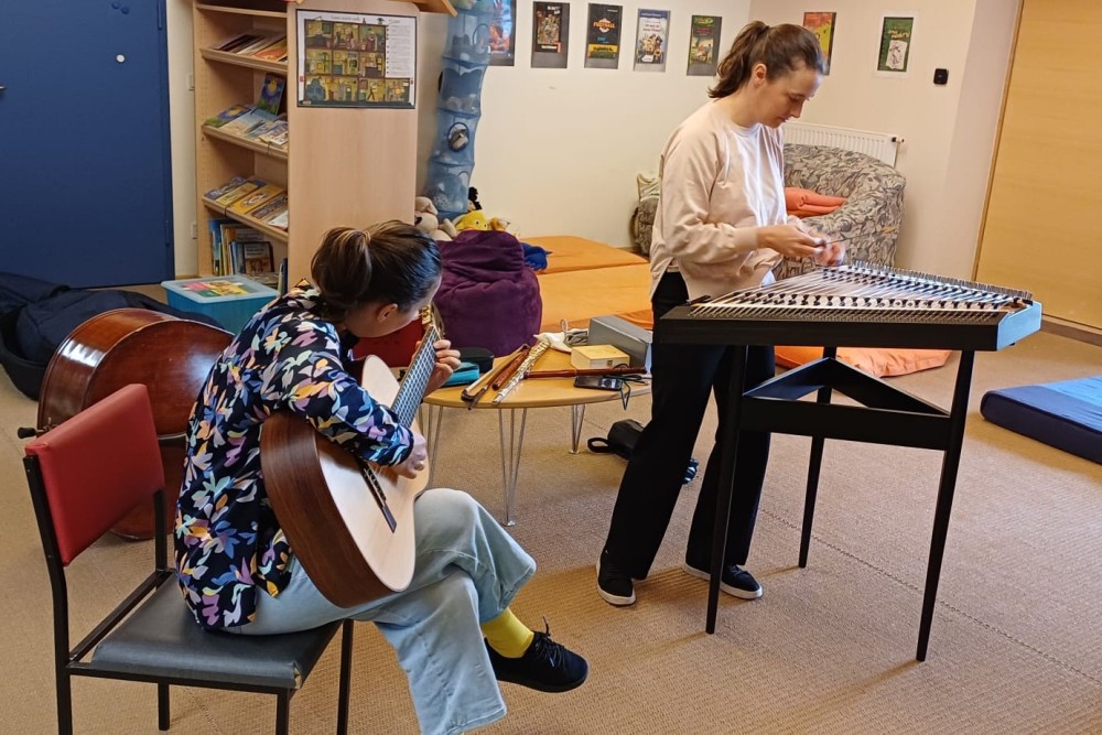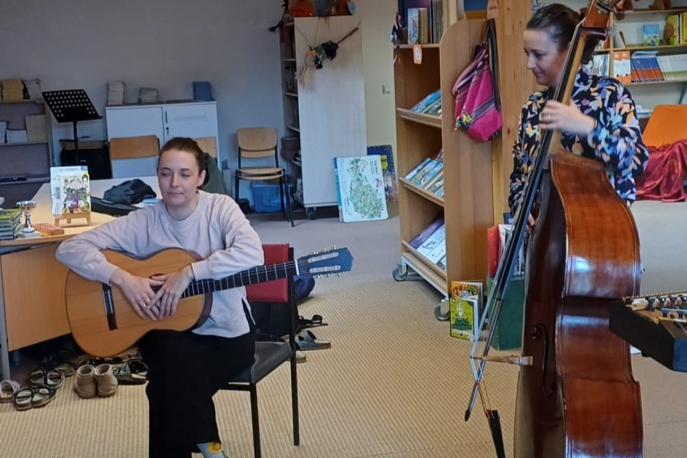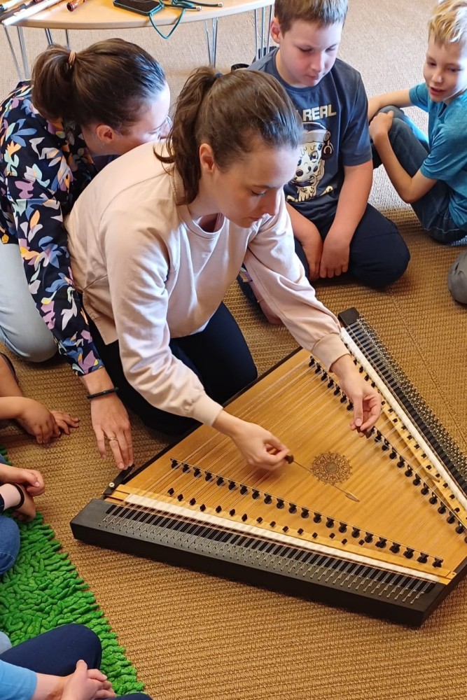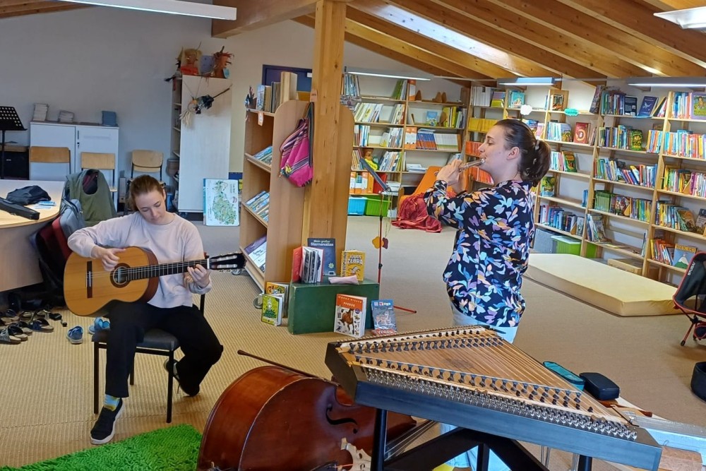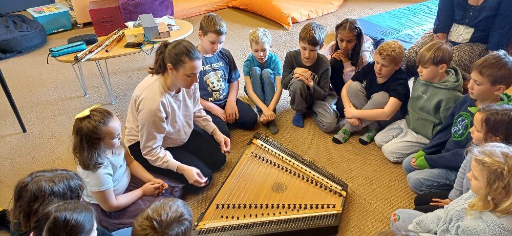 Im Rahmen einer Kulturservice-Veranstaltung waren die Vielsaitigen zu Besuch in der 2b Klasse, begeisterten die Kinder mit Musikstücken und weckten das Interesse für das Hackbrett, die Querflöte, die Gitarre und den Kontrabass.