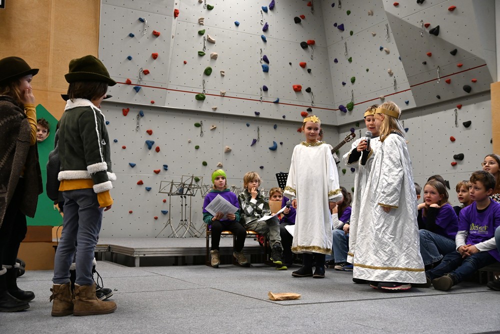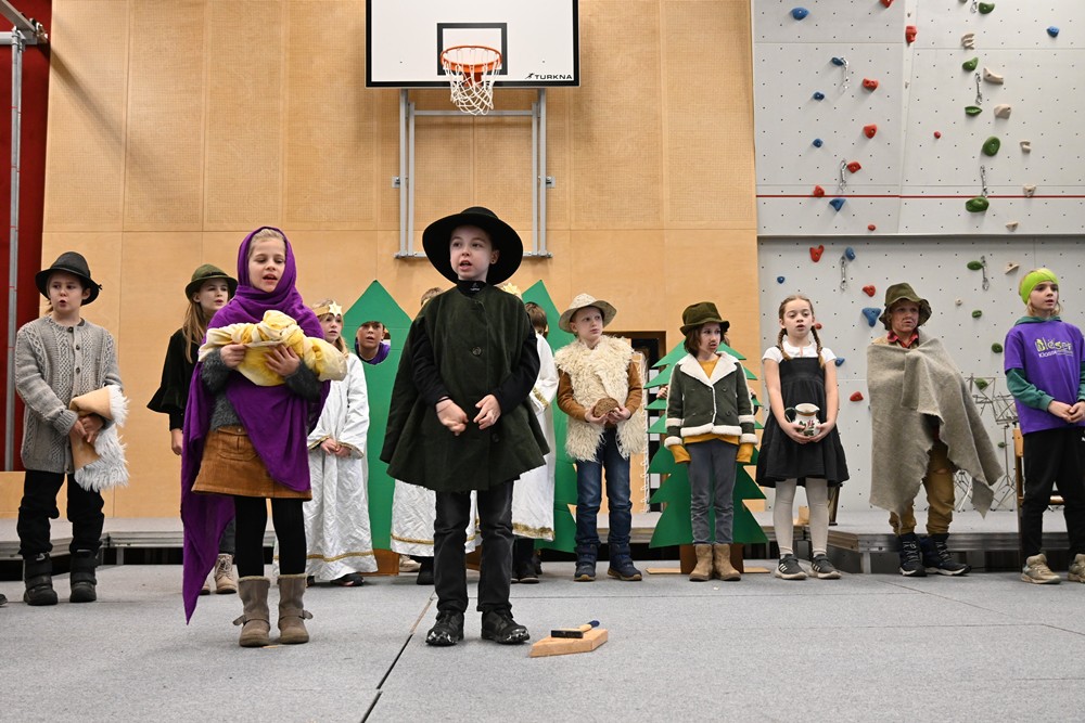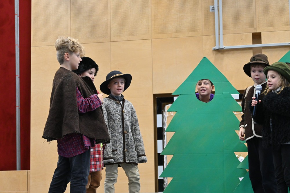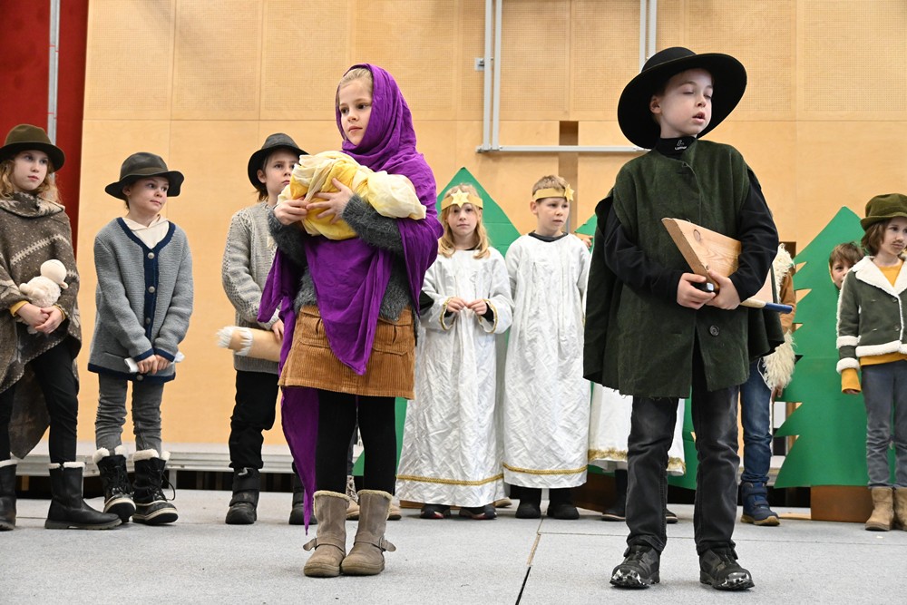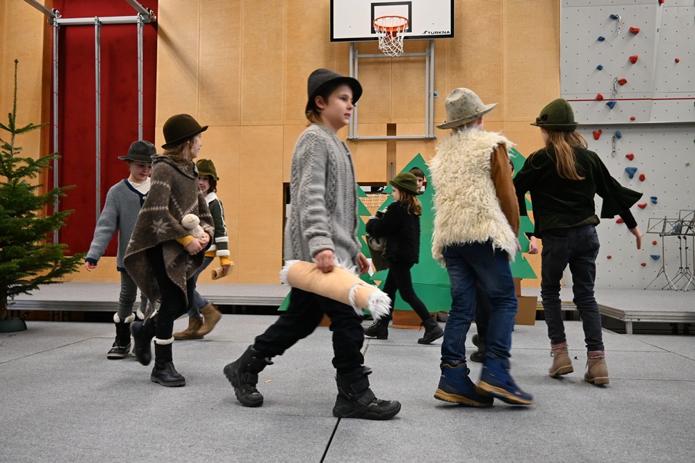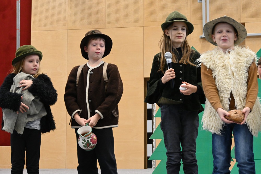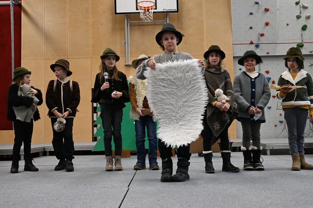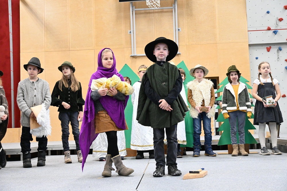 Jedes Jahr ist auch die VS Bad Häring beim Pölvenzauber dabei: Heuer stellte sich die neue Bläserklasse vor und erhielt begeisterten Applaus von einem großen Publikum. Es war staunenswert, dass die Kinder nach den wenigen Wochen Unterricht schon so toll drei Musikstücke spielten. Und auch für das Hirtenspiel hatten die Kinder der dritten Klassen gut einstudiert: Als die Engel die Geburt eines besonderen Kindes verkündet hatten, machten sich die Hirten mit ihren Geschenken auf den Weg, aber einen Teil davon schenken sie bereits unterwegs an bedürftige Menschen her. Den drei Räubern, die das beobachteten gefiel das gar nicht, denn lieber hätten sie sich in einem passenden Moment die große Beute geholt. Als sie schließlich selbst auch etwas geschenkt erhielten, anstatt rauben zu müssen, berührte das ihr Herz und mit der Räuberei war es vorbei.